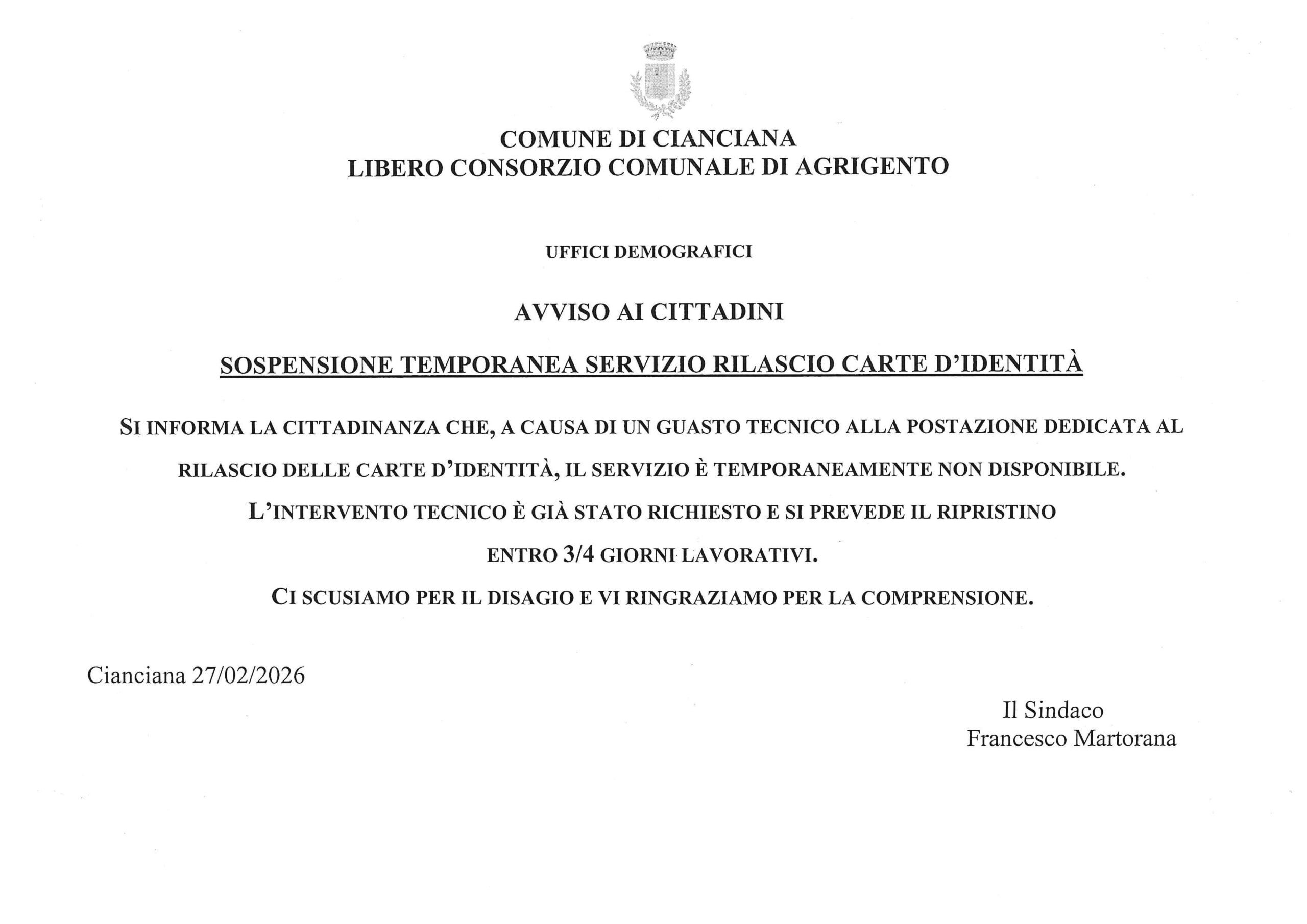 SI INFORMA LA CITTADINANZA CHE, A CAUSA DI UN GUASTO TECNICO ALLA POSTAZIONE DEDICATA AL RILASCIO DELLE CARTE D’IDENTITÀ, IL SERVIZIO È TEMPORANEAMENTE NON DISPONIBILE. L’INTERVENTO TECNICO È GIÀ STATO RICHIESTO E SI PREVEDE IL RIPRISTINO