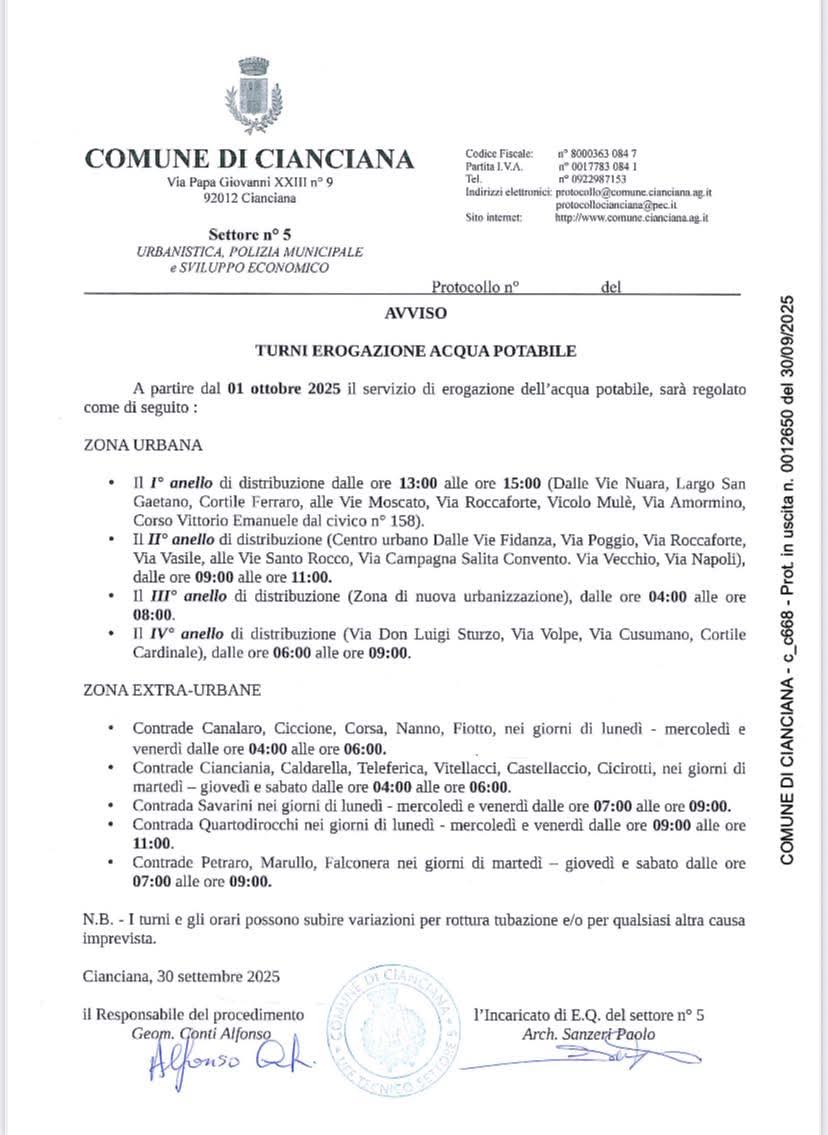 N.B. – I turni e gli orari possono subire variazioni per rottura tubazione e/o per qualsiasi altra causa imprevista.